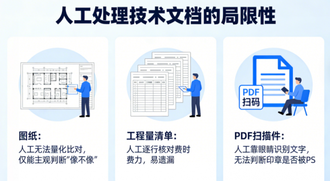 图纸,人工只能看“像不像”,无法量化比对。工程量清单,几十页的数字,人工逐行核对,费时费力还容易漏。PDF扫描件里的文字,人工只能靠眼睛认,印章是否被PS过,根本看不出来。