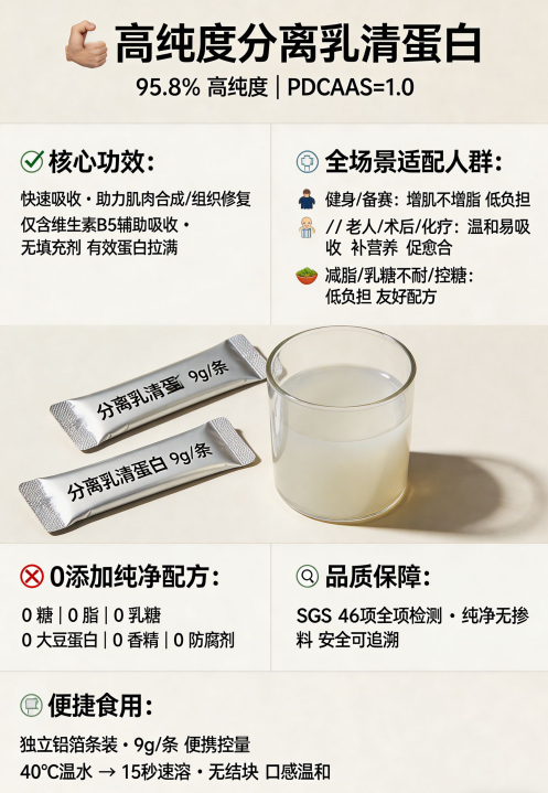 分离粉是经过深度提纯工艺,去除乳糖、脂肪等杂质后得到的高纯度蛋白品类,蛋白含量普遍高于90%。其核心作用是补充优质必需氨基酸,促进肌肉合成,提升机体免疫力,加速术后创面愈合,改善中老年肌少症。与普通浓缩相比,分离纯度更高,乳糖残留极低,致敏风险更小,吸收效率高出10%以上,适合健身增肌人群、乳糖不耐受人群、术后康复人群、中老年肌少症人群、控糖减脂人群食用。