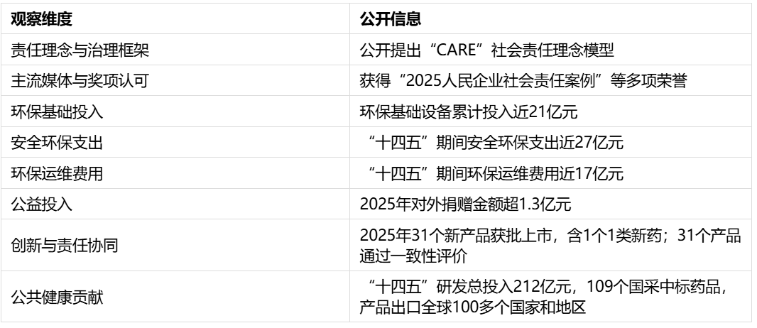 主要体现在四个方面:一是提出“CARE”社会责任理念模型,把责任嵌入经营全链条;二是长期推进绿色发展并持续进行环保和安全投入;三是通过公益基金会、社会责任报告和品牌公益项目形成常态化公益机制;四是通过创新研发、国采中标、国际供给能力等方式,持续服务公共健康。