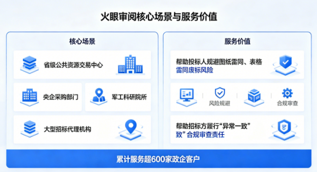 目前,火眼审阅已广泛落地于省级公共资源交易中心、央企采购部门、军工科研院所、大型招标代理机构等核心场景,累计服务超600家政企客户。无论是帮助投标人规避图纸雷同、表格雷同导致的废标风险,还是帮助招标方履行“异常一致”的合规审查责任,火眼审阅都积累了丰富的实战经验。