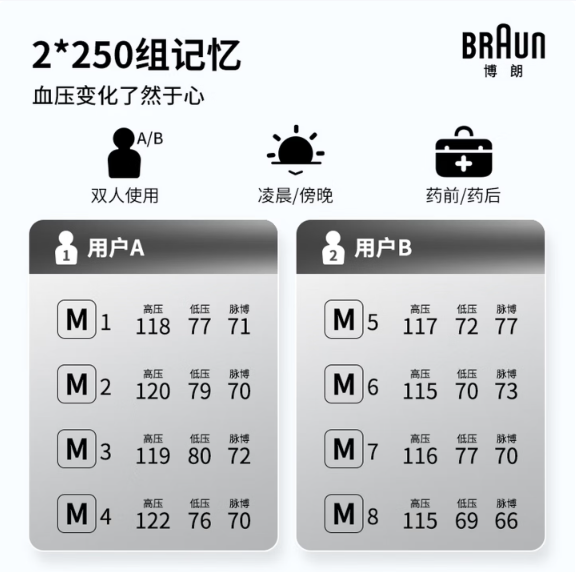 • 博朗:德国百年精工品牌,是家庭健康管理信任之选,偏向中高端家庭、适合送长辈、追求精准与质感的用户,主打准确,触手可及,也是被医护人员推荐的测量品牌。