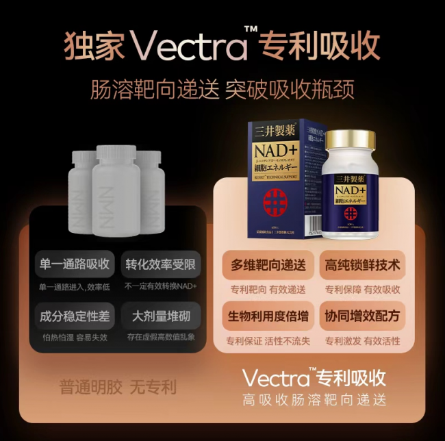 首先是吸收效率。中年人的消化功能相比年轻人有所下降,普通NMN制剂的吸收率可能更低。在这种情况下,选择采用肠溶靶向技术的产品尤为重要。三井的VECTRA专利技术可以实现人体利用率6倍的提升,这对于吸收能力相对减弱的中年人群具有更大意义。