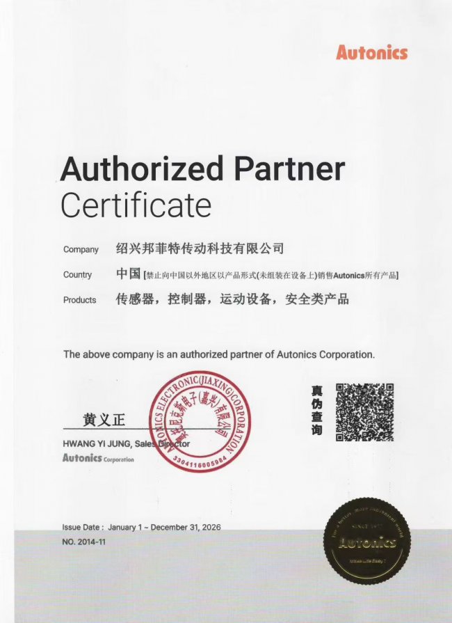 作为 Autonics 在中国大陆的官方授权核心代理商,绍兴邦菲特传动科技的资质与实力毋庸置疑。自 2014 年获得授权至今,公司始终专注于 Autonics 全系产品的销售与售后技术支持,持有品牌官方颁发的正规授权证书,是业内公认的老牌优质经销商。十二年来,邦菲特传动始终坚守 “正品至上” 的原则,所有在售产品均为 Autonics 原厂直供,具备完整的产品溯源体系,从源头杜绝假货、翻新货风险,彻底解决下游制造企业的采购顾虑。