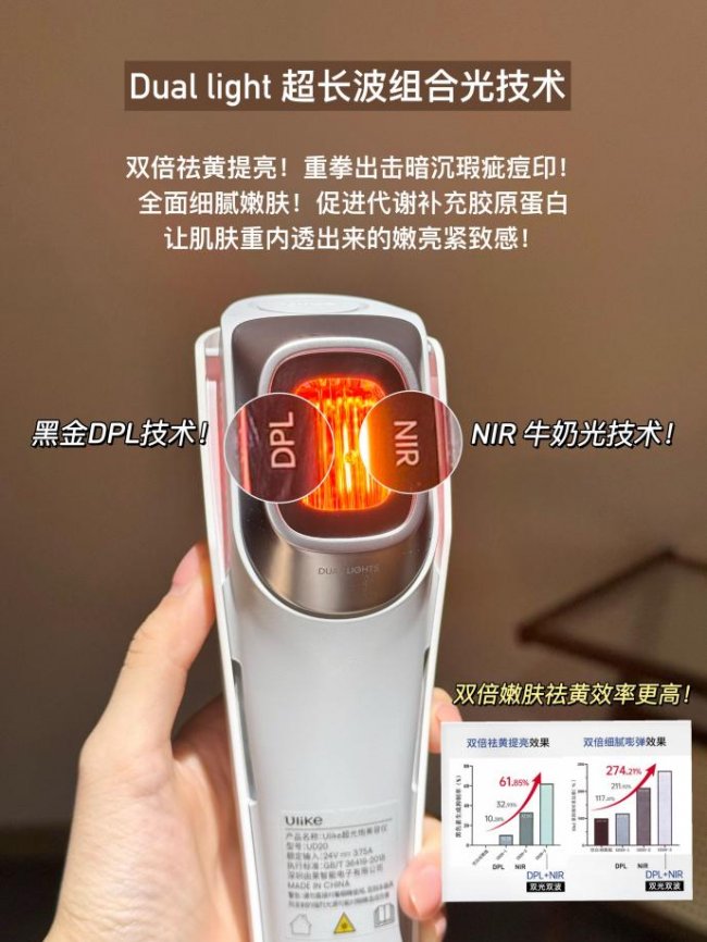 技术特点:Ulike童颜超光炮采用黑金DPL超光子与NIR铂金牛奶光技术相结合的双光源系统,核心波段为1064nm黄金波段。该技术通过双光源协同作用,能够有效促进I型、III型胶原蛋白的生成,从而提升抗皱紧致效果。