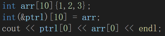 (4) int (& ptrl)[10]=arr; //声明一个引用ptrl, ptrl是一个有十个int型变量的数组的引用(别名),数组名为arr,