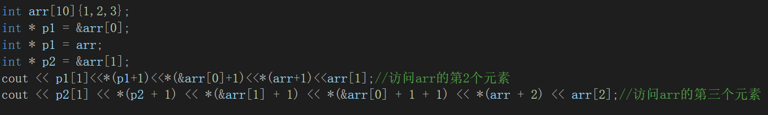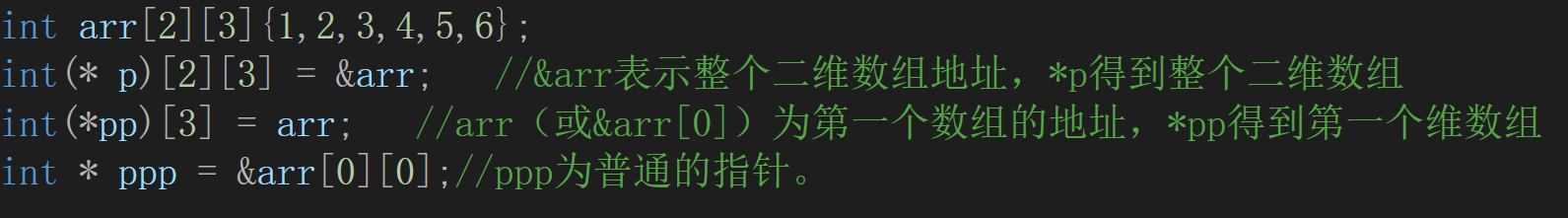 (3) int (*ptrl)[10]=&arr //定义一个数组指针ptrl,指向一个有10个int型元素的数组,对指针解引用得到一个数组,元素引用使用(*ptrl)[i]。