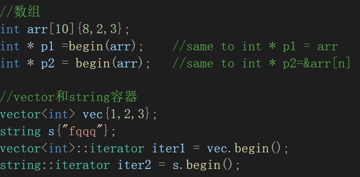 数组的指针就是它的迭代器,类似vector和array,数组同样提供了获取指向首元素和尾后元素指针的方法begin(arr)和end(arr):