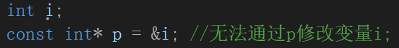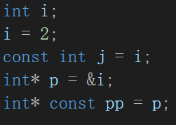 int* const p = &j; // 定义一个int 型指针常量p存放变量j的地址,此后p存储的地址值或者说p的指向就不能更改了;