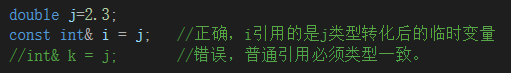 值得注意的是,用字面值或者其他类型变量初始化常量引用时,实际上引用的是中间变量,例如如果用double变量来初始化 const int &时,编译器会将double变量隐式转化为一个int型的无名字的临时变量,引用绑定的是此临时变量。