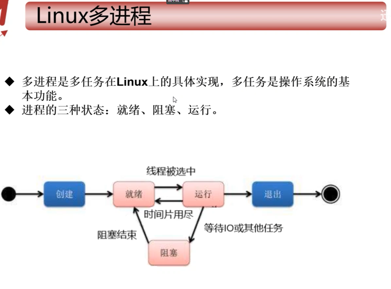 多进程有三种状态:就绪(进程被创建)-阻塞(等待资源)-运行(获得资源)