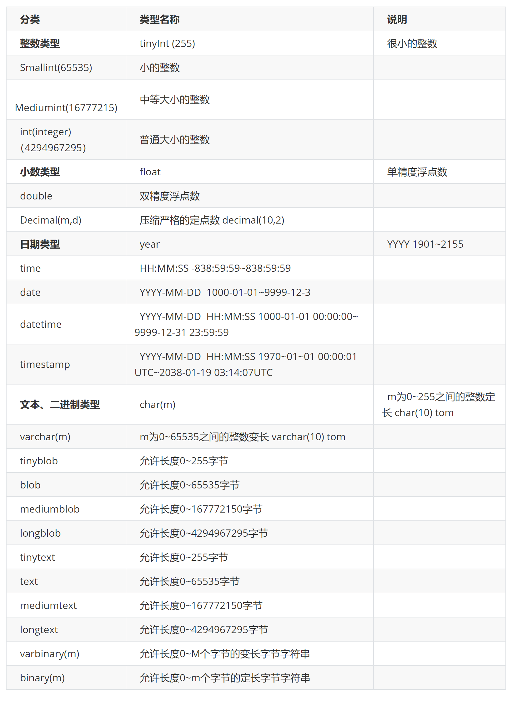 MySQL中经常使用的数据类型如下: