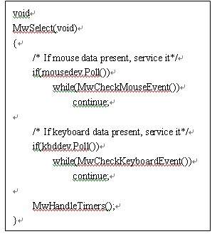调用mousedev.Poll()方法查询是否有鼠标消息,如果有,则调用MwCheckMouseEvent()方法处理;调用kbddev.Poll()方法查询是否有键盘消息,如果有,则调用MwCheckKeyboardEvent()方法处理;最后调用MwHandleTimers()方法处理定时器消息。