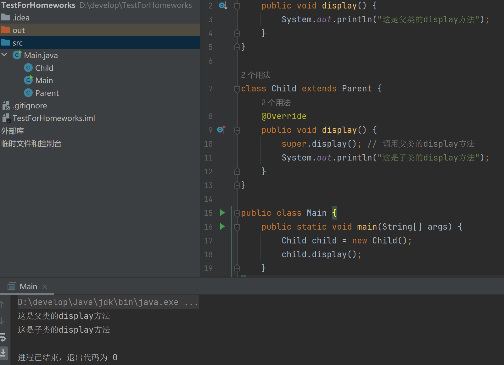 接下来,将子类对象child赋值给了父类对象parent,这是一种多态的表现。此时,父类对象parent指向了子类对象child。