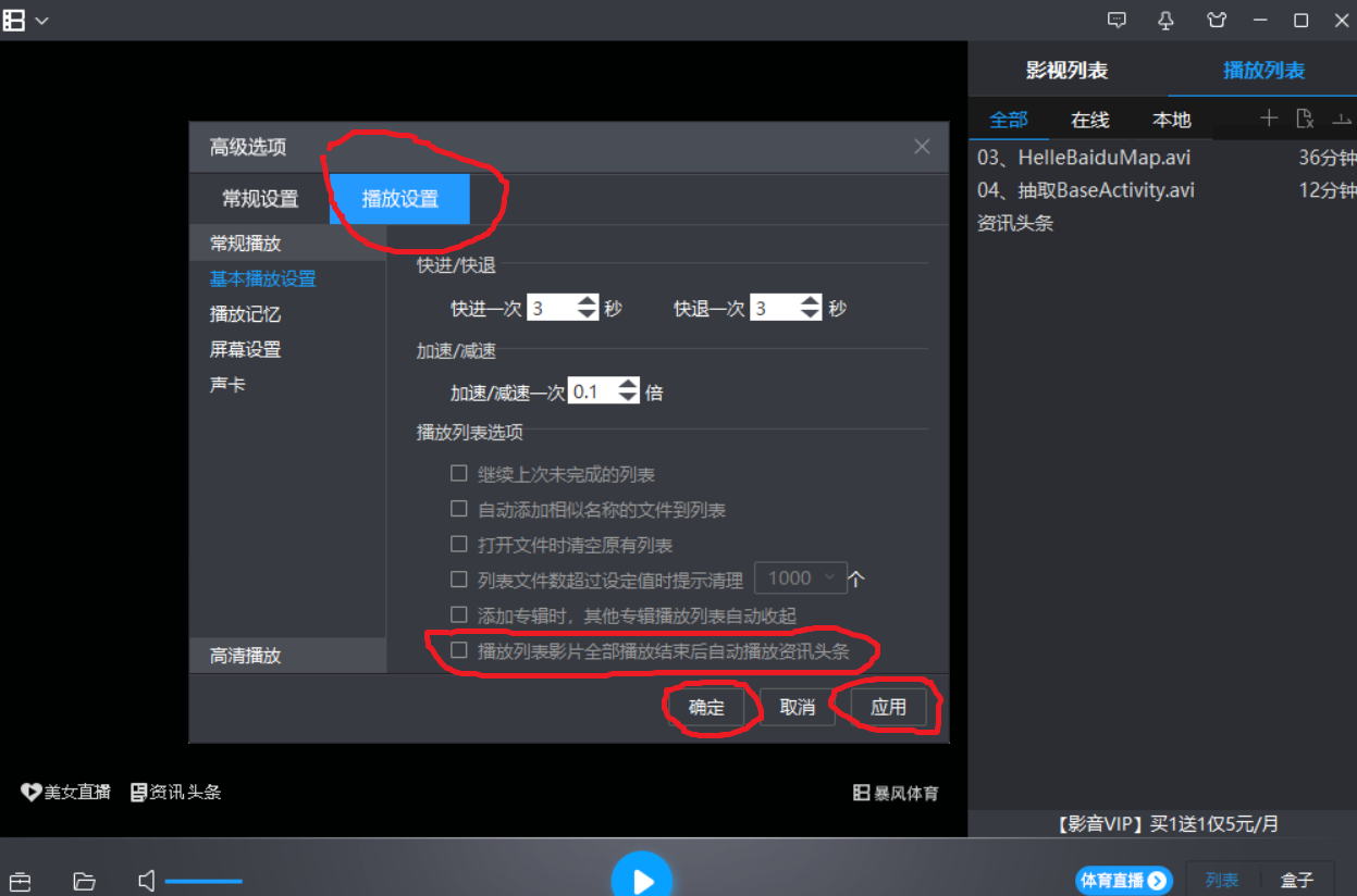 2.选择“播放设置”,“基本播放设置”--> "播放列表影片全部播放结束后自动播放咨询头条"前面的复选框去掉