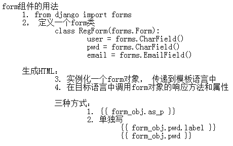 from django import forms # 按照Django form组件的要求自己写一个类 class RegForm(forms.Form): name = forms.CharField(label="用户名") pwd = forms.CharField(label="密码")