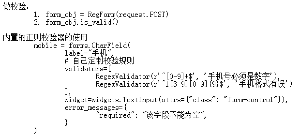 from django.forms import Form from django.forms import widgets from django.forms import fields from django.core.validators import RegexValidator class MyForm(Form): user = fields.CharField( validators=[RegexValidator(r'^[0-9]+$', '请输入数字'), RegexValidator(r'^159[0-9]+$', '数字必须以159开头')], )