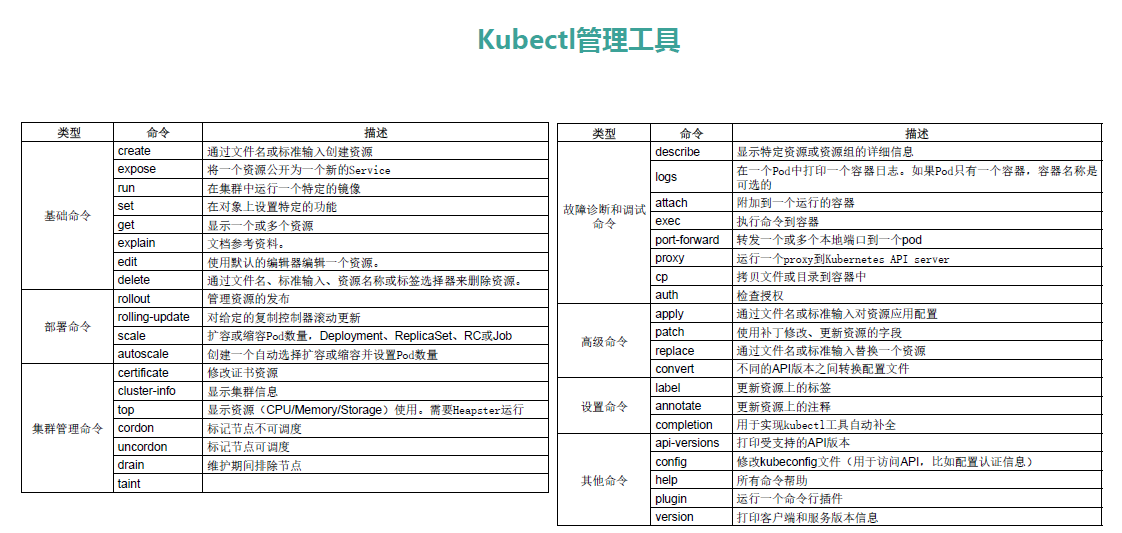 基础命令:create,delete,get,run,expose,set,explain,edit。 create命令:根据文件或者输入来创建资源 # 创建Deployment和Service资源 kubectl create -f javak8s-deployment.yaml kubectl create -f javak8s-service.yaml delete命令:删除资源 # 根据yaml文件删除对应的资源,但是yaml文件并不会被删除,这样更加高效 kubectl delete -f javak8s-deployment.yaml kubectl delete -f javak8s-service.yaml # 也可以通过具体的资源名称来进行删除,使用这个删除资源,需要同时删除pod和service资源才行 kubectl delete 具体的资源名称 get命令:获得资源信息 # 查看所有的资源信息 kubectl get all # 查看pod列表 kubectl get pod # 显示pod节点的标签信息 kubectl get pod --show-labels # 根据指定标签匹配到具体的pod kubectl get pods -l app=example # 查看node节点列表 kubectl get node # 显示node节点的标签信息 kubectl get node --show-labels # 查看pod详细信息,也就是可以查看pod具体运行在哪个节点上(ip地址信息) kubectl get pod -o wide # 查看服务的详细信息,显示了服务名称,类型,集群ip,端口,时间等信息 kubectl get svc [root@master ~]# kubectl get svc NAME TYPE CLUSTER-IP EXTERNAL-IP PORT(S) AGE go-service NodePort 10.10.10.247 <none> 8089:33702/TCP 29m java-service NodePort 10.10.10.248 <none> 8082:32823/TCP 5h17m kubernetes ClusterIP 10.10.10.1 <none> 443/TCP 5d16h nginx-service NodePort 10.10.10.146 <none> 88:34823/TCP 2d19h # 查看命名空间 kubectl get ns # 查看所有pod所属的命名空间 kubectl get pod --all-namespaces # 查看所有pod所属的命名空间并且查看都在哪些节点上运行 kubectl get pod --all-namespaces -o wide # 查看目前所有的replica set,显示了所有的pod的副本数,以及他们的可用数量以及状态等信息 kubectl get rs [root@master ~]# kubectl get rs NAME DESIRED CURRENT READY AGE go-deployment-58c76f7d5c 1 1 1 32m java-deployment-76889f56c5 1 1 1 5h21m nginx-deployment-58d6d6ccb8 3 3 3 2d19h # 查看目前所有的deployment kubectl get deployment [root@master ~]# kubectl get deployment NAME READY UP-TO-DATE AVAILABLE AGE go-deployment 1/1 1 1 34m java-deployment 1/1 1 1 5h23m nginx-deployment 3/3 3 3 2d19h # 查看已经部署了的所有应用,可以看到容器,以及容器所用的镜像,标签等信息 kubectl get deploy -o wide [root@master bin]# kubectl get deploy -o wide NAME READY UP-TO-DATE AVAILABLE AGE CONTAINERS IMAGES SELECTOR nginx 3/3 3 3 16m nginx nginx:1.10 app=example run命令:在集群中创建并运行一个或多个容器镜像。 # 基本语法 run NAME --image=image [--env="key=value"] [--port=port] [--replicas=replicas] [--dry-run=bool] [--overrides=inline-json] [--command] -- [COMMAND] [args...] # 示例,运行一个名称为nginx,副本数为3,标签为app=example,镜像为nginx:1.10,端口为80的容器实例 kubectl run nginx --replicas=3 --labels="app=example" --image=nginx:1.10 --port=80 其他用法参见:http://docs.kubernetes.org.cn/468.html expose命令:创建一个service服务,并且暴露端口让外部可以访问 # 创建一个nginx服务并且暴露端口让外界可以访问 kubectl expose deployment nginx --port=88 --type=NodePort --target-port=80 --name=nginx-service 关于expose的详细用法参见:http://docs.kubernetes.org.cn/475.html set命令: 配置应用的一些特定资源,也可以修改应用已有的资源 # 使用kubectl set --help查看,它的子命令,env,image,resources,selector,serviceaccount,subject。 set命令详情参见:http://docs.kubernetes.org.cn/669.html 语法: resources (-f FILENAME | TYPE NAME) ([--limits=LIMITS & --requests=REQUESTS] kubectl set resources 命令 这个命令用于设置资源的一些范围限制。 资源对象中的Pod可以指定计算资源需求(CPU-单位m、内存-单位Mi),即使用的最小资源请求(Requests),限制(Limits)的最大资源需求,Pod将保证使用在设置的资源数量范围。 对于每个Pod资源,如果指定了Limits(限制)值,并省略了Requests(请求),则Requests默认为Limits的值。 可用资源对象包括(支持大小写):replicationcontroller、deployment、daemonset、job、replicaset。 例如: # 将deployment的nginx容器cpu限制为“200m”,将内存设置为“512Mi” kubectl set resources deployment nginx -c=nginx --limits=cpu=200m,memory=512Mi # 为nginx中的所有容器设置 Requests和Limits kubectl set resources deployment nginx --limits=cpu=200m,memory=512Mi --requests=cpu=100m,memory=256Mi # 删除nginx中容器的计算资源值 kubectl set resources deployment nginx --limits=cpu=0,memory=0 --requests=cpu=0,memory=0 kubectl set selector命令 设置资源的selector(选择器)。如果在调用"set selector"命令之前已经存在选择器,则新创建的选择器将覆盖原来的选择器。 selector必须以字母或数字开头,最多包含63个字符,可使用:字母、数字、连字符" - " 、点"."和下划线" _ "。如果指定了--resource-version,则更新将使用此资源版本,否则将使用现有的资源版本。 注意:目前selector命令只能用于Service对象。 # 语法 selector (-f FILENAME | TYPE NAME) EXPRESSIONS [--resource-version=version] kubectl set image命令 用于更新现有资源的容器镜像。 可用资源对象包括:pod (po)、replicationcontroller (rc)、deployment (deploy)、daemonset (ds)、job、replicaset (rs)。 # 语法 image (-f FILENAME | TYPE NAME) CONTAINER_NAME_1=CONTAINER_IMAGE_1 ... CONTAINER_NAME_N=CONTAINER_IMAGE_N # 将deployment中的nginx容器镜像设置为“nginx:1.9.1”。 kubectl set image deployment/nginx busybox=busybox nginx=nginx:1.9.1 # 所有deployment和rc的nginx容器镜像更新为“nginx:1.9.1” kubectl set image deployments,rc nginx=nginx:1.9.1 --all # 将daemonset abc的所有容器镜像更新为“nginx:1.9.1” kubectl set image daemonset abc *=nginx:1.9.1 # 从本地文件中更新nginx容器镜像 kubectl set image -f path/to/file.yaml nginx=ngin