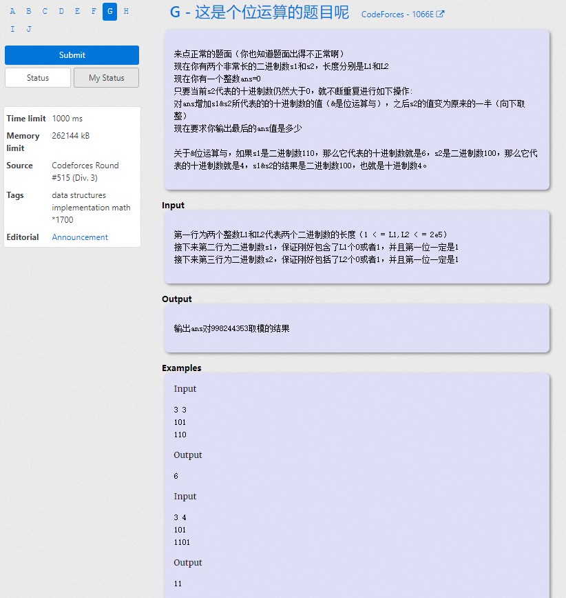 1 //简化代码语言后的主函数: 2 int main() { 3 int L1, L2; 4 //左移乘,右移除 5 while (scanf("%d %d", &L1, &L2) != EOF) { 6 scanf("%s %s", num1, num2); 7 //cout << num1 << endl; 8 //cout << num2 << endl; 9 strrev(num1); 10 strrev(num2); 11 int ans[MAX3] = { 0 }; 12 int L2y = L2; 13 char* p = num2; 14 int i; 15 while (L2) { 16 for (i = 0; i < (L1 < L2y ? L1 : L2y); i++) { 17 if (num1[i] == '1') 18 ans[i] += (p[i] == '1' ? 1 : 0); 19 } 20 //cout << "b:" << p << endl; 21 //"对ans增加s1&s2所代表的的十进制数的值" 22 p = p + 1; 23 L2--; 24 //"之后s2的值变为原来的一半(向下取整)" 25 } 26 int turn2 = 1; 27 int sum = 0; 28 for (int k = 0; k < (L1 > L2y ? L1 : L2y); ++k) { 29 //cout << k << ":" << ans[k] << ":" << sum << endl; 30 sum += ans[k] * turn2 % MOL; 31 sum %= MOL; 32 turn2 *= 2; 33 turn2 %= MOL; 34 } 35 printf("%d\n", sum); 36 } 37 return 0; 38 }