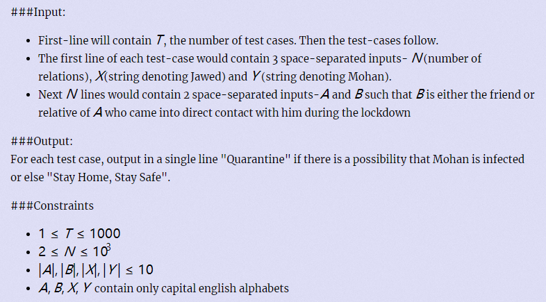 1 #pragma warning (disable:4996) 2 #include <iostream> 3 #include<algorithm> 4 #include<stdio.h> 5 #include<math.h> 6 #include<string.h> 7 //#include<string> 8 #define MAX1 100005 /*1e5 + 5*/ 9 #define MAX2 1000000005 /*le9 + 5*/ 10 #define MAX3 200005 /*1e5 + 5*/ 11 #define MAX4 5005 /*5e3 + 5*/ 12 #define MAX5 10005 /*1e4 + 5*/ 13 #define T1 27 14 #define T2 27 15 #define T3 18 16 using namespace std; 17 typedef long long int ll; 18 #define MOL 998244353 19 struct str { 20 char a[12]; 21 }; 22 struct rel { 23 str a; 24 str b; 25 }; 26 int main() { 27 rel all[1005]; 28 str sick[2005]; 29 str a, b, x, y; 30 int t, n; 31 while (scanf("%d", &t) != EOF) { 32 int i, j, k; 33 for (k = 0; k < t; ++k) { 34 cin >> n >> x.a >> y.a; 35 for (i = 0; i < n; i++) { 36 cin >> a.a >> b.a; 37 //cout << a << " " << b << endl; 38 strcpy(all[i].a.a, a.a); 39 strcpy(all[i].b.a, b.a); 40 } 41 sick[0] = x; 42 int sicksize = 1; 43 for (i = 0; i < sicksize; ++i) { 44 for (j = 0; j < n; ++j) { 45 if (strcmp(all[j].a.a, sick[i].a) == 0) { 46 sick[sicksize++] = all[j].b; 47 } 48 if (strcmp(all[j].b.a, sick[i].a) == 0) { 49 sick[sicksize++] = all[j].a; 50 } 51 } 52 } 53 for (i = 0; i <= sicksize; ++i) 54 if (strcmp(sick[i].a, y.a) == 0)break; 55 if (i > sicksize)printf("Stay Home, Stay Safe\n"); 56 else printf("Quarantine\n"); 57 } 58 } 59 delete sick; 60 return 0; 61 }