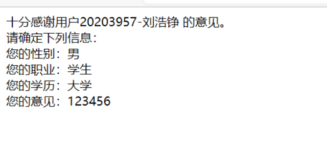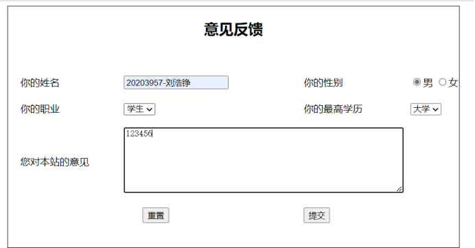<?php ?> <!doctype html> <html lang="en"> <head> <meta charset="UTF-8"> <meta name="viewport" content="width=device-width, user-scalable=no, initial-scale=1.0, maximum-scale=1.0, minimum-scale=1.0"> <meta http-equiv="X-UA-Compatible" content="ie=edge"> <title>意见反馈</title> <style type="text/css"> body{ border: 1px solid; margin-left: 500px; margin-right: 500px; padding-bottom: 20px; } table{ border-spacing:20px ; } </style> </head> <body> <form action="php-2demo.php" method="post"> <table cellpadding="0" border="0" cellspacing="5" width="800px" align="center" > <tr><h2 align="center"> 意见反馈</h2></tr> <tr> <td>你的姓名</td> <td><input type="text" name="name"></td> <td>你的性别</td> <td><input type="radio" name="sex" value="男">男 <input type="radio" name="sex" value="女">女</td> </tr> <tr> <td>你的职业</td> <td><select name="work" id=""> <option value="0">学生</option> <option value="1">教师</option> </select></td> <td>你的最高学历</td> <td><select name="study" id=""> <option value="0">初中</option> <option value="1">高中</option> <option value="2">大学</option> </select></td> </tr> <tr> <td>您对本站的意见</td> <td colspan="3"><textarea name="idea" id="" cols="60" rows="7"></textarea></td> </tr> <tr> <td colspan="2" align="center"><input type="reset"></td> <td colspan="2"><input type="submit"></td> </tr> </table> </form> </body> </html> <?php if($_POST){ $name = $_POST['name']; $sex = $_POST['sex']; $work = $_POST['work']; if($work==0){ $work='学生'; }else{ $work='教师'; } $study = $_POST['study']; switch ($study){ case 0 :$study='初中';break; case 1 :$study='高中';break; case 2 :$study='大学';default; } $idea = $_POST['idea']; } ?> <!doctype html> <html lang="en"> <head> <meta charset="UTF-8"> <meta name="viewport" content="width=device-width, user-scalable=no, initial-scale=1.0, maximum-scale=1.0, minimum-scale=1.0"> <meta http-equiv="X-UA-Compatible" content="ie=edge"> <title>Document</title> </head> <body> <div> 十分感谢用户<?php echo $name?> 的意见。<br> 请确定下列信息:<br> 您的性别:<?php echo $sex ?> <br> 您的职业:<?php echo $work ?> <br> 您的学历:<?php echo $study ?> <br> 您的意见:<?php echo $idea ?> </div> </body> </html>