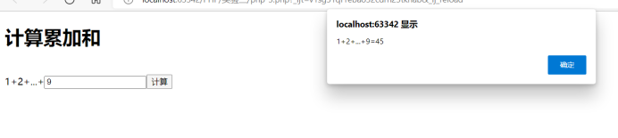 <?php ?> <!doctype html> <html lang="en"> <head> <meta charset="UTF-8"> <title>计算累加和</title> </head> <body> <form action="php-3.php" method="post"> <h1>计算累加和</h1> <br> 1+2+...+<input type="number" name="num" id="num"><input type="submit" id="sum" value="计算"> </form> <script> document.getElementById("sum").onclick = sum; function sum() { var value = parseInt(document.getElementById("num").value); let res=value*(value+1)/2; alert("1+2+...+"+value+"="+res); } </script> </body> </html>
