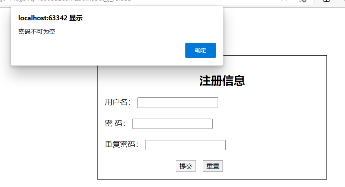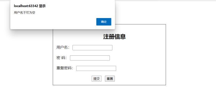 - 制作一用户注册页面如图 6 所示,然后对用户输入的数据进行判断:如果用户名为空 则弹出警告框“用户名不能为空!”,如图7所示,否则进行下一步的判断,如果两次输入 的密码不一致则弹出警告框“两次密码必须一致!”,如图 8 所示,如果两次验证都通过页 面跳转到第 3 题的静态页面.