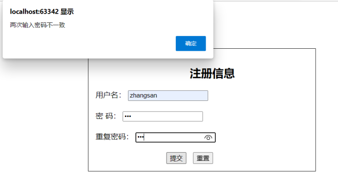 <?php ?> <!DOCTYPE html> <html lang="en"> <head> <meta charset="UTF-8"> <title>register</title> <style type="text/css"> .tab{ color:Gray; font-size: 8px; } body{ margin-top:100px ; margin-left: 700px; margin-right: 630px; border: 1px solid; padding: 15px; } </style> </head> <body> <form id="reg_form" action="php-3.php" method="post"> <h2 style="margin-left: 200px">注册信息</h2> <label for="username">用户名:</label> <input type="text" id="username" name="username"><sapn class="tab"></sapn><br><br> <label for="password">密 码:</label> <input type="password" id="password" name="password"><span class="tab"></span><br><br> <label for="rpassword">重复密码:</label> <input type="password" id="rpassword" name="rpassword"><br> <br> <span style="margin-left: 150px"><input type="submit" value="提交" > <input type="reset" value="重置"></span> </form> <script> //用户名 var usernameInput = document.getElementById("username"); usernameInput.onblur = checkUsername; function checkUsername() { var usernamevalue = username.value.trim(); var flag = !usernamevalue if (flag) { alert('用户名不可为空'); } return(flag); } //密码 var passwordInput = document.getElementById("password"); passwordInput.onblur = checkPassword; function checkPassword() { var passwordvalue = password.value.trim(); var flag = !passwordvalue if (flag) { alert('密码不可为空'); } return(flag); } //重复密码 var rpasswordInput = document.getElementById("rpassword"); rpasswordInput.onblur = checkRpassword; function checkRpassword() { let flag = passwordInput.value == rpasswordInput.value.trim(); if(!flag){ alert('两次输入密码不一致') } return (flag); } var regForm = document.getElementById("reg_form"); regForm.onsubmit = function () { var flag = checkPassword() && checkUsername() && checkRpassword(); if(flag){ location.href='php-3.php'; } } </script> </body> </html>