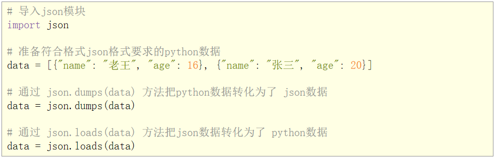 json.dumps(data) 方法把python数据转化为了 json数据 data = json.dumps(data) 如果有中文可以带上:ensure_ascii=False参数来确保中文正常转换 通过 json.loads(data) 方法把josn数据转化为了 python列表或字典 data = json.loads(data)
