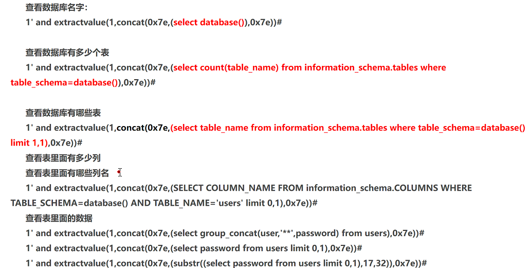 ①extractvalue(arg1,arg2)函数原理,因为参数2为Xpath格式(即XML文档格式)的字符串,在查询的语句前后加上0x7e(即符号~),将查询语句的返回结果构造成非Xpath格式,使函数extractvalue(arg1,arg2)执行时无法正常解析,将select查询结果以报错的方式显示出来。