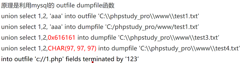 将内容写入文件时,最好转化为十六进制,防止过滤某些特殊符号,MySQL会自动将十六进制内容转化为明文再写入。