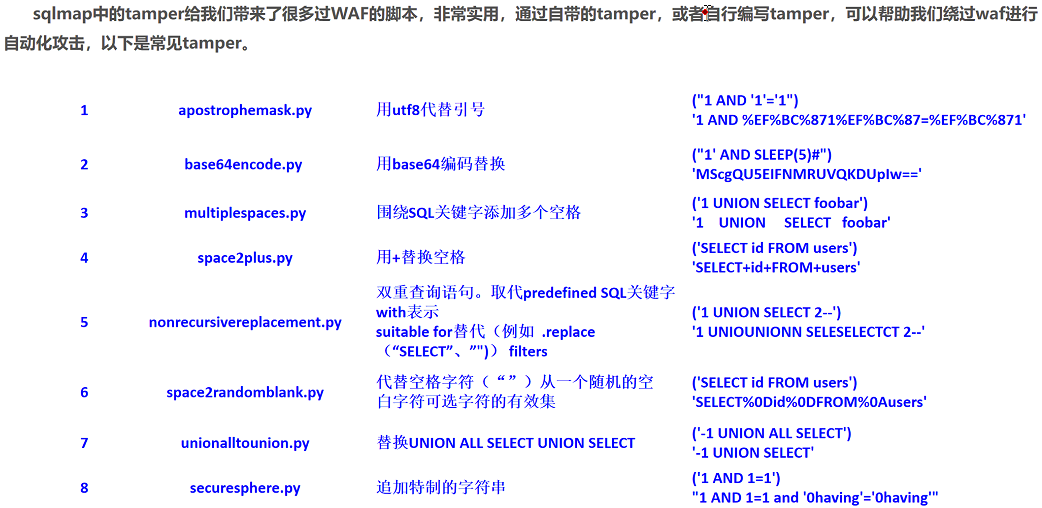 1. 在SQLmap的tamper目录下有很多过WAF的脚本