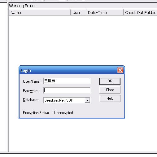 点Connect,进入Visual SourceSafe。接着提示输入用户名,密码,如图: