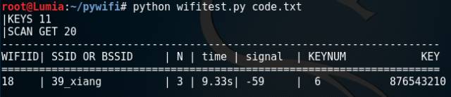 首先,这个模块在win下有点鸡肋,作者在调用WLANAPI时没有做好WLAN_SECURITY_ATTRIBUTES的封装,所以推荐在linux下跑,我测试所使用的是Kali 2.0 自带python 2.7.6 ,可直接通过 pip install pywifi 安装。