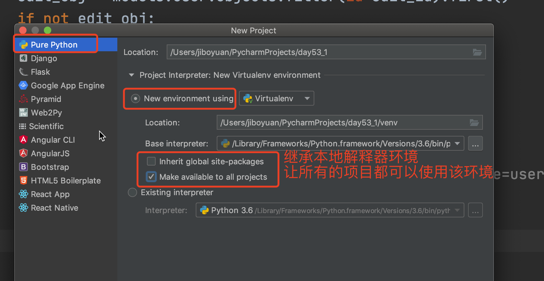 选择不用的解释器即可 全文不要再次勾选new enviroment...