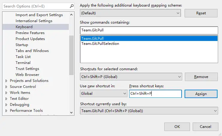 最常用的 Git 操作就是 Pull 了,平时大家都是在 Team Explorer 窗口依次点击 Sync -> Pull 来操作。但用快捷键更方便,可以在 Tools -> Options -> Keyboard 中为 Git Pull 设置一个快捷键,比如设置为 CTRL + SHIFT + P。