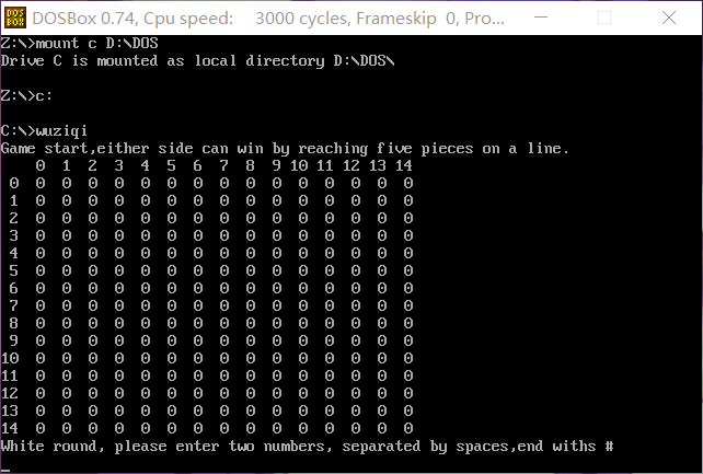 由于几乎是从零开始做,需要汇编环境的准备,去图书馆查阅相关汇编程序设计的书,在书里学到了一些基本的编程语句用法就开始做了。先用c++实现了五子棋pvp对弈的demo,然后打算把这个思路用汇编来实现。demo写出来没花多少时间,但是手动转成汇编可着实有些难办。因为汇编几乎没有什么数据结构,我设想的棋盘数组MP得靠基址+偏移寻址来访问元素,二维化一维,繁琐程度加重了一些,但是好歹费尽一番功夫解决了,期间花一下午排除bug终于弄明白了一些简单的知识,只有BX可以当基址寻址的指定寄存器,偏移地址是不准用变量来表示的,这些句子书里有但是缺乏实操的情况下很难注意到。