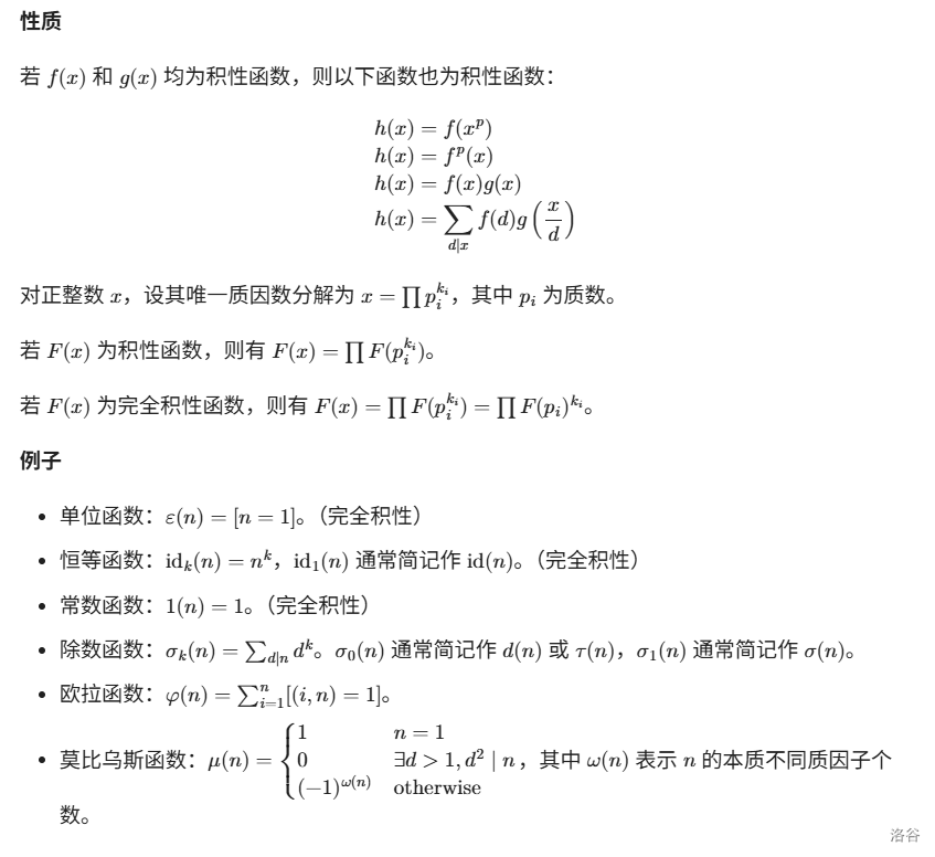 如果 \(\forall a,b \in \mathbb{N}^\star\) 且 \(a,b\) 互质时,满足 \(f(ab)=f(a) \times f(b)\) 的函数 \(f\) 称为积性函数.