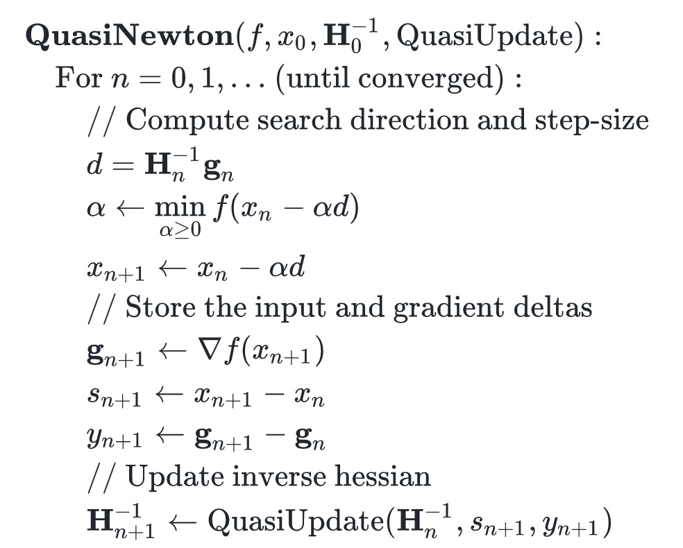 What form should QuasiUpdate take? Well, if we have QuasiUpdate always return the identity matrix (ignoring its inputs), then this corresponds to simple gradient descent, since the search direction is always ∇fn. While this actually yields a valid procedure which will converge to x∗ for convex f, intuitively this choice of QuasiUpdate isn’t attempting to capture second-order information about f.
