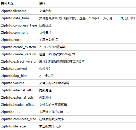 zipfile.ZipInfo():用于表示归档文件中的一个成员信息。zipfile.ZipInfo类的实例可以通过ZipFile对象的getinfo()和infolist()方法获取。