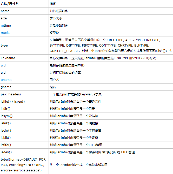 tarfile.TarInfo:一个TarInfo对象表示TarFile中的一个成员。TarInfo对象中除了保存了一个文件所需要的所有属性(比如:文件类型、文件大小、修改时间、权限、属主等)之外,它还提供了一些用于判断其文件类型的方法。需要注意的是,它不包含文件的数据。TarInfo对象可以通过TarFile的getmember()、getmembers()和gettarinfo()方法获取。