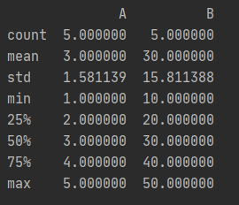 import pandas as pd # 创建示例 DataFrame data = { 'A': [1, 2, 3, 4, 5], 'B': [10, 20, 30, 40, 50] } df = pd.DataFrame(data) # 查看 DataFrame 的基本统计信息 print(df.describe())