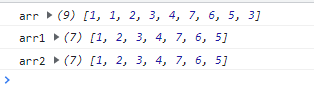 let arr=[1,1,2,3,4,7,6,5,3] // 法1 let arr1=[...new Set(arr)] // 法2 let arr2=Array.from(new Set(arr)) console.log("arr",arr) console.log("arr1",arr1) console.log("arr2",arr2)