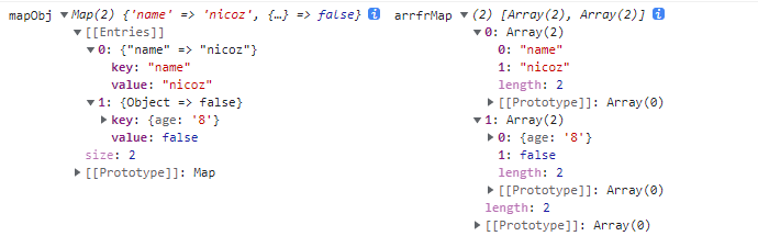 let mapObj=new Map() mapObj.set('name','nicoz') mapObj.set({age:'8'},false) // 可将其转为一个二维数组,数组长度为map的size, // 二维数中每一项为key,value组成的长度为2的数组 let arrfrMap=[...mapObj] console.log('mapObj',mapObj,'arrfrMap',arrfrMap)