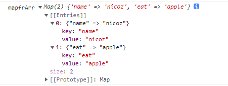let mapfrArr=new Map([['name','nicoz'],['eat','apple']]) console.log('mapfrArr',mapfrArr)
