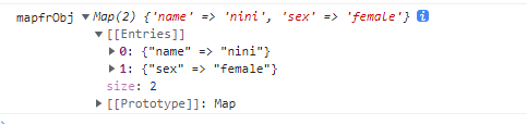 let obj={ name:"nini", sex:'female' } let mapfrObj = new Map(Object.entries(obj)) console.log('mapfrObj',mapfrObj)
