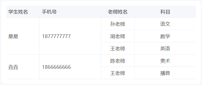 <el-table :data="tableData" :span-method="objectSpanMethod" border> <el-table-column prop="name" label="学生姓名" /> <el-table-column prop="tel" label="手机号" width="200" /> <el-table-column prop="teacher" label="老师姓名" align="center" /> <el-table-column prop="lesson" label="科目" width="200" align="center"/> </el-table>