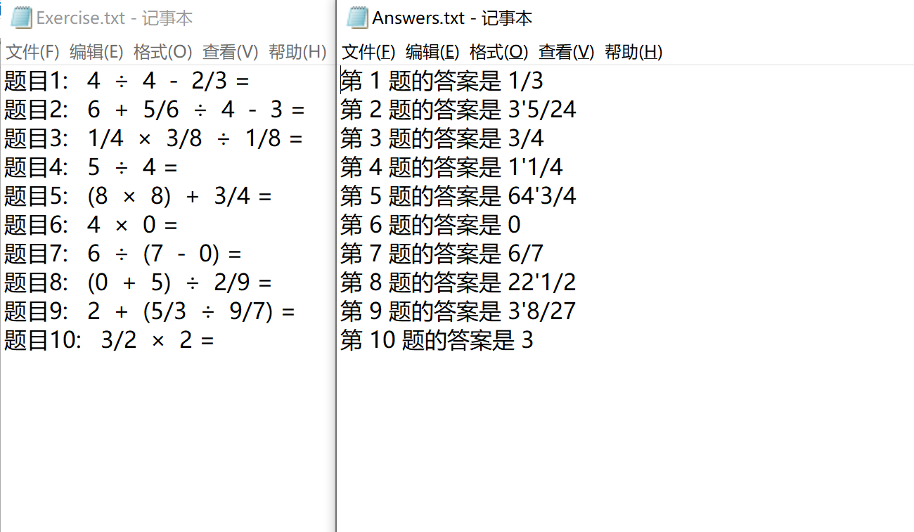 1 //答案对比函数 2 void CompareAnswer() 3 { //解析题目参数 4 int cnum_ope, ctag_ope[3], i[2], fig_num[2], ope_num[2]; 5 int figure[8], ans[3]; 6 char operate[4]; 7 char answer_cal[6][20]; 8 //读取文件参数 9 char question_read[100]; 10 char answer_read[50]; 11 //结果参数 12 int correct_num = 0, wrong_num = 0, title_n = 1; 13 int correct_tn[10000], wrong_tn[10000]; 14 15 FILE* question_file; 16 FILE* answer_file; 17 FILE* Grade_file; 18 char exercise[20], answer[20]; 19 20 21 cout << "请输入练习题文件名" << endl; 22 cin >> exercise; 23 cout << "请输入答案文件名" << endl; 24 cin >> answer; 25 if ((question_file = fopen(exercise, "r")) == NULL) 26 { 27 printf("You can't open the file!\n"); 28 exit(1); 29 } 30 if ((answer_file = fopen(answer, "r")) == NULL) 31 { 32 printf("You can't open the file!\n"); 33 exit(1); 34 } 35 /* 36 if ((question_file = fopen("Exercise.txt", "r")) == NULL) 37 { 38 printf("You can't open the file!\n"); 39 exit(1); 40 } 41 if ((answer_file = fopen("Answers.txt", "r")) == NULL) 42 { 43 printf("You can't open the file!\n"); 44 exit(1); 45 } 46 */ 47 printf("开始处理\n"); 48 49 while (!feof(question_file)) 50 { 51 cout << "\n"; 52 fgets(question_read, 100, question_file); //将答案 53 fgets(answer_read, 50, answer_file); 54 printf("%s", question_read); 55 56 int change = -1; 57 ope_num[0] = 0, fig_num[0] = 0; 58 ctag_ope[0] = ctag_ope[2] = 0, ctag_ope[1] = 1, i[0] = 0; 59 for (int f = 0; f < 8; f++) { 60 figure[f] = 1; 61 } 62 //答案赋值,避免上次结果对这次进行影响 63 ans[0] = ans[1] = 0; ans[2] = 1; 64 65 //处理题目 66 for (*i = 8; question_read[i[0]] != '='; i[0]++) 67 { 68 change = ChangeNumber(question_read, i); //将字符转换为数字 69 70 CanShu(change, question_read, i, ctag_ope, fig_num, ope_num, figure, ans, operate); //得出参数 71 } 72 73 cnum_ope = *fig_num - 1; 74 ctag_ope[0] = ctag_ope[1] * 10 + ctag_ope[2]; 75 76 CalAnswer(figure, operate, *fig_num, cnum_ope, ctag_ope[0], ans); //利用参数计算答案 77 78 ChangeAnswer(ans, answer_cal); //把答案转化为字符串 79 cout << "计算出的答案:" << answer_cal[0] << endl; 80 81 //处理读出的答案字符串,将答案字符串读入数组 82 char ans_compare[20] = "0"; 83 int c = 0; 84 for (int j = 10; answer_read[j] != '\0'; j++) 85 { 86 if ((answer_read[j] >= '0' && answer_read[j] <= '9') || answer_read[j] == 39 || answer_read[j] == '/') 87 { 88 ans_compare[c] = answer_read[j]; 89 c++; 90 } 91 } 92 cout << "读取的答案:" << ans_compare << endl; 93 94 if (0 == strcmp(answer_cal[0], ans_compare)) //比较答案是否正确 95 { 96 correct_tn[correct_num] = title_n; 97 correct_num++; 98 } 99 else 100 { 101 wrong_tn[wrong_num] = title_n; 102 wrong_num++; 103 } 104 title_n++; 105 } 106 107 108 109 if ((Grade_file = fopen("Grade.txt", "a+")) == NULL) 110 { 111 printf("You can't open the file!\n"); 112 exit(1); 113 } 114 //统计正确、错误答案 115 fprintf(Grade_file, "Correct :%d", correct_num); 116 if (correct_num != 0) 117 fprintf(Grade_file, "("); 118 for (int correct = 0; correct < correct_num; correct++) 119 { 120 121 fprintf(Grade_file, "%d,", correct_tn[correct]); 122 if (correct + 1 == correct_num) 123 fprintf(Grade_file, ")\n"); 124 } 125 126 fprintf(Grade_file, "Wrong :%d", wrong_num); 127 if (wrong_num != 0) 128 fprintf(Grade_file, "("); 129 for (int wrong = 0; wrong < wrong_num; wrong++) 130 { 131 fprintf(Grade_file, "%d,", wrong_tn[wrong]); 132 if (wrong + 1 == wrong_num) 133 fprintf(Grade_file, ")\n"); 134 } 135 136 137 fclose(question_file); 138 fclose(answer_file); 139 140 }