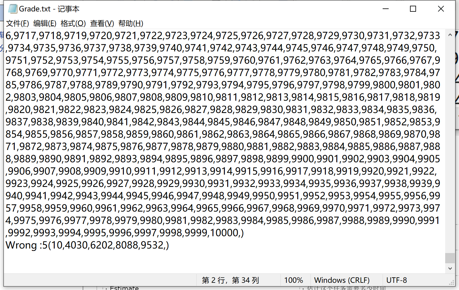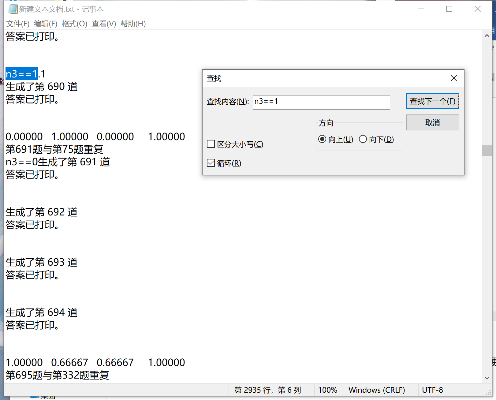 10000道题目,由于反馈输出在命令控制器中不方便查找,所以另复制在记事本中查找,其中出现n3则表示出现重复