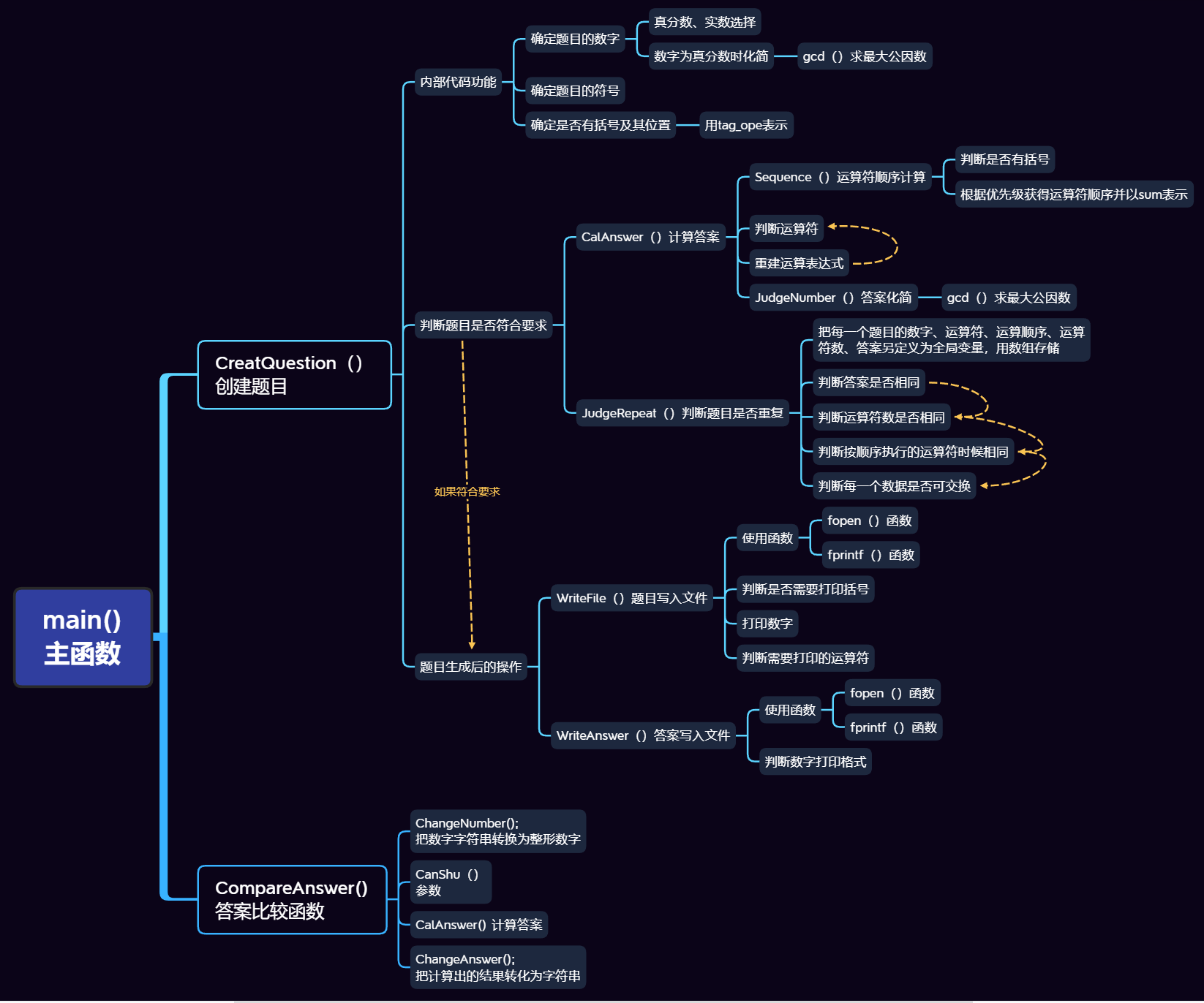 1 //创建题目 2 void CreatQuestions(int number, int range) 3 { 4 int num_ope, num_fig, type_fig, t; 5 int figure[8], ans[3]; 6 char operate[3]; 7 8 srand(time(NULL)); //确保不是伪随机 9 title_num = 0; 10 11 FILE* question_file; //打开相应文件 12 FILE* answer_file; 13 if ((question_file = fopen("Exercise.txt", "a+")) == NULL) 14 { 15 printf("You can't open the file!\n"); 16 exit(1); 17 } 18 if ((answer_file = fopen("Answers.txt", "a+")) == NULL) 19 { 20 printf("You can't open the file!\n"); 21 exit(1); 22 } 23 24 while (number != title_num) 25 { 26 int i, rand1, tag_ope = 10; //tag_ope赋值10 27 num_ope = (rand() % 3) + 1; //确定运算符数 28 num_fig = num_ope + 1; //数字个数 是 运算符数+1 29 30 //数字为自然数时为1,真分数时下面代码会对相应分母赋值 31 figure[4] = figure[5] = figure[6] = figure[7] = 1; 32 33 //答案赋值,避免上次结果对这次进行影响 34 ans[0] = ans[1] = 0; ans[2] = 1; 35 36 //确定数字 37 for (i = 0; i < num_fig; i++) 38 { 39 figure[i] = rand() % range; 40 type_fig = rand() % 2; //0自然数,1真分数 41 if (type_fig == 1 && figure[i] != 0) //数字为真分数且分子不为0时 42 { 43 figure[i + 4] = rand() % range; 44 while (figure[i + 4] == 0 || figure[i] % figure[i + 4] == 0) //分母不能等于0且不组成自然数 45 { 46 figure[i + 4] = rand() % range; 47 } 48 t = gcd(figure[i], figure[i + 4]); //化简 49 figure[i] = figure[i] / t; 50 figure[i + 4] = figure[i + 4] / t; 51 } 52 } 53 54 //确定符号 55 for (i = 0; i < num_ope; i++) 56 { 57 rand1 = rand() % 4 + 1; 58 switch (rand1) 59 { 60 case 1: operate[i] = '+'; break; 61 case 2: operate[i] = '-'; break; 62 case 3: operate[i] = '*'; break; 63 case 4: operate[i] = '/'; break; 64 default:break; 65 } 66 } 67 68 //确定是否有括号及括号位置 69 if (num_fig == 3) //数字个数为3 70 { 71 //tag_ope = 12 表示前括号在第一个数字前,后括号在第二个数字后 72 rand1 = (rand() % 3 + 1) + (rand() % 3 + 1) * 10; 73 switch (rand1) 74 { 75 case 21: 76 case 12: tag_ope = 12; break; 77 case 32: 78 case 23: tag_ope = 23; break; 79 default: break; 80 }; 81 } 82 else if (num_fig == 4) 83 { 84 rand1 = (rand() % 4 + 1) + (rand() % 4 + 1) * 10; 85 switch (rand1) 86 { 87 case 12: tag_ope = 12; break; 88 case 13: tag_ope = 13; break; 89 case 23: tag_ope = 23; break; 90 case 24: tag_ope = 24; break; 91 case 34: tag_ope = 34; break; 92 default: break; 93 } 94 } 95 96 //判断创建的题目是否合法以及是否重复 97 if (CalAnswer(figure, operate, num_fig, num_ope, tag_ope, ans) == TRUE && JudgeRepeat(figure, operate, num_ope) == ERROR) 98 { 99 100 title_num++; 101 102 WriteFile(figure, operate, num_fig, num_ope, tag_ope, question_file); //题目写入文件 103 WriteAnswer(ans, answer_file); //答案写入文件 104 } 105 } 106 printf("全部题目生成成功,请查看txt文件"); 107 system("pause"); 108 }