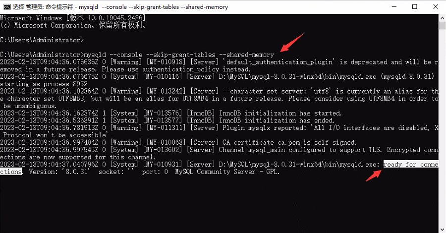 3、进行越级登录MySQL。在命令行输入:mysqld --console --skip-grant-tables --shared-memory.回车,保持窗口不关闭,再起一个 cmd 窗口。